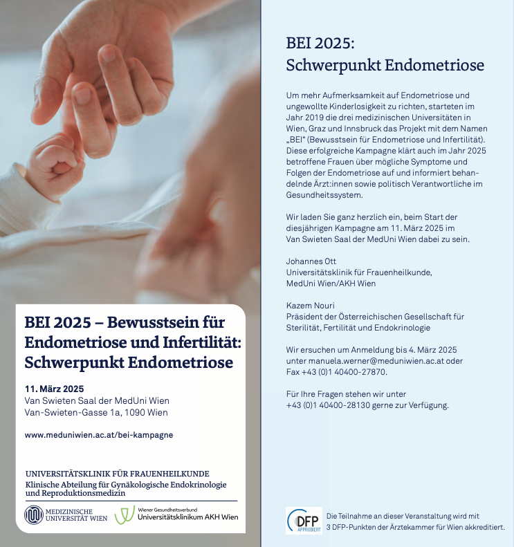 Um mehr Aufmerksamkeit auf Endometriose und ungewollte Kinderlosigkeit zu richten, starteten im Jahr 2019 die drei medizinischen Universitäten in Wien, Graz und Innsbruck das Projekt mit dem Namen„BEI“ (Bewusstsein für Endometriose und Infertilität). Diese erfolgreiche Kampagne klärt auch im Jahr 2025 betroffene Frauen über mögliche Symptome und Folgen der Endometriose auf und informiert behandelnde Ärzt:innen sowie politisch Verantwortliche im Gesundheitssystem. … Read More